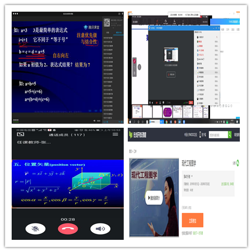 以《高等数学l(2)》、《工程图学l(2)》、《大学物理l(1)》和《C语言程序设计》四门核心课程为例:任课教师普遍采用直播授课的方式,以QQ微信群为基础,借助腾讯课堂、QQ共享屏幕语音通话、ZOOM、学习通等技术手段,完成课程的签到、讲解、互动、测试与作业。此外,由于各学科教学需求与各教学班学习情况存在差异,任课教师们在具体操作方式上进行了调整、补充、创新,旨在激发学生学习兴趣,进而提升学生自主学习、独立思考的能力。