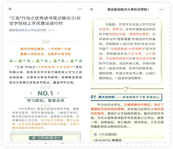 活动开展以来,学院内掀起了一股读书热潮,学生利用课余时间广泛阅读并撰写读书心得。学院微信公众号开设“‘三自’行动之优秀读书笔记展示”专栏,展示学生的读书笔记。一个月以来,学院累计收到投稿四十余篇并将精选内容在学院平台展示。