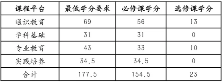本专业学生在各课程平台中所修读的课程学分数需满足培养方案中各课程平台最低学分要求,在校期间学生需修满177.5学分方可毕业。各课程平台最低学分要求如下: