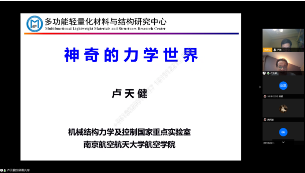 第二个模块,卢天健老师回顾了自己的海外求学经历,又详细介绍了自己的主要研究方向——轻量化,他表示降低结构重量是航空航天追求的永恒主题,并先后介绍了结构轻量化的意义与应用、生物多孔结构。卢老师从20年前开始研究超轻多孔材料和结构,他详细介绍了多孔金属的四个多样化特征和在交通运载工具、航天工程、现代化国防方面的需求,同时,卢老师还介绍了自己的研究思路:立足力学,开展多学科交叉研究,并向大家展示了他带领团队承担的项目情况和取得的主要成绩。第三个模块,卢老师用丰富多样的例子展现了“无处不在的力学”,包括手机触摸屏的力学、微电子力学,还有一些平常难以与力学联合在一起的研究内容,如皮肤热-力-电耦合理论、含液多孔生物材料、神经力学等。卢老师特别指出力学的终极目标是脑科学,而他本人新的研究方向也是大脑的防护力学。一系列介绍颠覆了学生对于力学的传统认知!卢老师表示,他十分注重本科生的培养,并且“晒”出了他指导的本科生进行的研究情况和取得的成就,卢老师鼓励学生勇于挑战,他也欢迎同学们到他的实验室参观,与他交流。最后,卢老师留下了对长空学子的寄语:搏击长空,追梦力学!