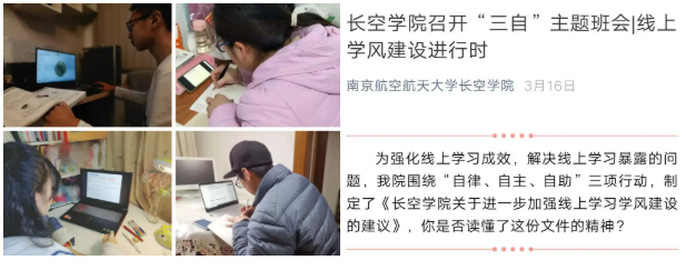 大学和高中最大的区别就是自主学习,一个只有学会和适应了自主学习的大学生才是一个合格的大学生,也只有自主学习到家的学生才有可能成为一个优秀的大学生,同学们有这样的一种意识让我们非常欣慰,为你们的这些行为点赞。另外,我们的同学们没有因为老师不在身边就放松对自己的学习要求,所有的班级都开展了“三自”主题班会,探索和加强班级同学的自律、自主、自助管理,大家也知道,我们老师不在身边,这个学风怎么管,这都是新事物,以前在学校学习的时候辅导员每天盯着你们,我们的老师也经常督促你们,但是在线学习完全要靠自律、自主和自助,通过这样一种自发有效的班级管理,我们体现出了大学班级应有的样子。
