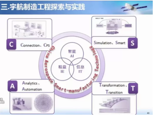 在宇航制造工程的探索与实践过程中,中国空间技术研究院提出以智能、精益和信息为核心,通过实现万物互联、信息和物体的融合,实现基于仿真的自动化,实现基于仿真的智能化以及通过以上三类技术手段的综合运用实现技术和模式的转型和变革,最终形成经济的装备、精益的组织、精湛的技艺和精品的卫星的整体架构。