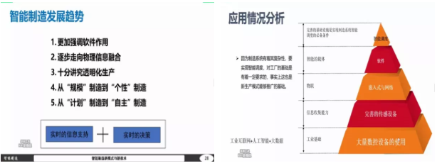 唐教授从用户、工人和管理者等不同层面出发,针对智能制造的新型生产模式展开探讨,并以贴近生活的打车方式为例,重点分析了以传统生产模式为代表的工业3.0和以智能制造为代表的工业4.0之间的区别,前者以流水线、按计划顺序操作、中央集中控制、自上而下以及刚性系统为主要特点,后者以单元化工艺、自律操作、分散控制、互联互通以及高柔性自组织系统为主要特点。他指出智能制造发展趋势:更强调软件作用,逐步走向物理信息融合,十分讲究透明化生产,从“规模”制造到“个性”制造,从“计划”制造到“自主”制造。实现智能制造的基本架构包括大量数控设备的适用,完善的传感设备,嵌入式与网络,软件以及智能调度。