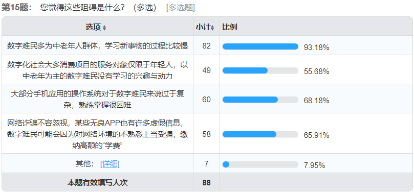此外,有七成以上的人认为在如今的网络环境下,“数字难民”想要融入数字化社会存在一定的阻碍,且大部分人认为其阻碍来源于数字难民多为中老年群体,接受新兴事物的过程比较缓慢。当然,网络诈骗的存在以及大部分手机应用的操作系统过于复杂也都被视为可能阻碍数字难民融入数字化社会的因素。