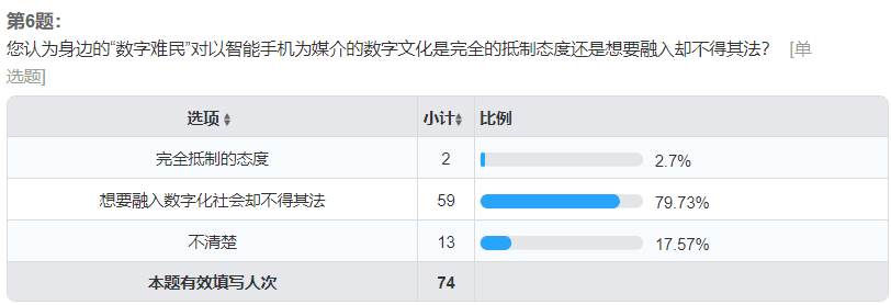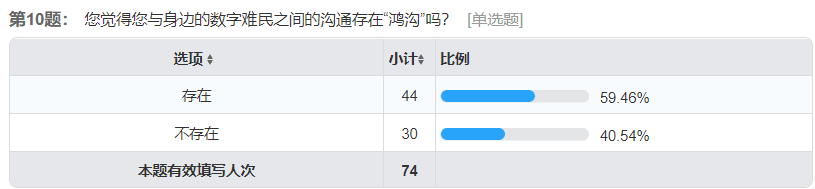 由于前期问卷调查采取线上模式,本问卷的受访者集中在18~25岁的人群,在所有被调查者中,大约有10%的人了解这一定义,而超过六成以上的人并未听说过数字难民这一概念,这从一定程度上反映了大众对“数字难民”这一概念比较模糊。