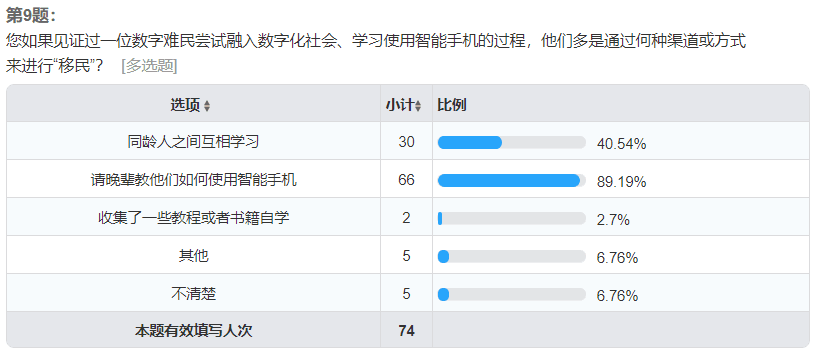 除此之外,对身边的“数字难民”在接触智能手机后尝试学习的APP,有百分之三十不到的受访者认为“数字难民”倾向于学习支付宝、淘宝等于线上支付和网购有关的APP,有百分之二十的人认为他们对今日头条等新闻资讯类APP更感兴趣,还有百分之三十六左右的人认为他们会选择抖音、快手等休闲娱乐类软件。并且,这些“数字难民”多是通过向晚辈以及同龄人学习来熟悉智能手机、尝试融入数字化社会。