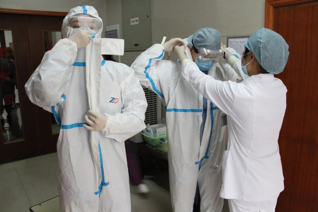 宁波援鄂医疗队的姜志清护士长和周丽燕护士在发热门诊为我们完整演示了防护服的穿脱过程,我们的两位队员也在指导下体验了防护服穿脱。