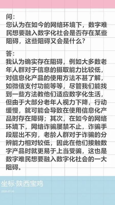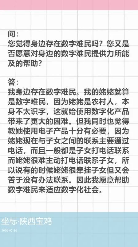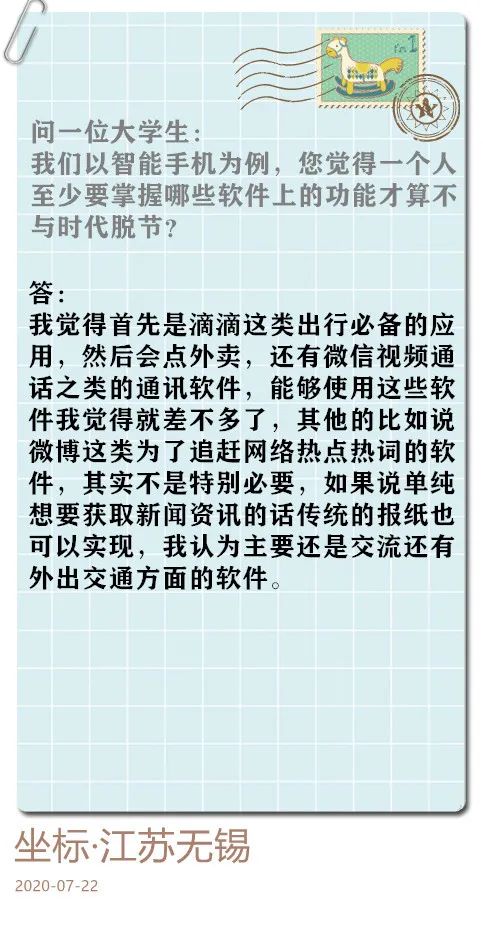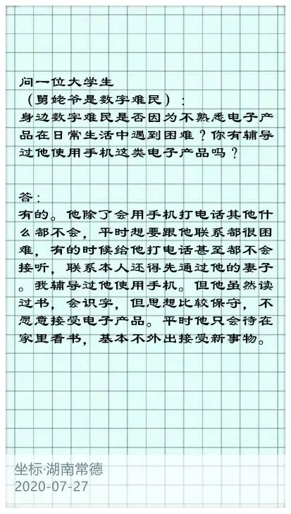 本次采访对象主要集中在18~20岁左右的年轻群体中,希望通过对年轻群体的采访,了解年轻群体对于社会中存在数字难民这一现象的关注程度以及年轻群体对于数字难民的认识和理解。同时年轻群体也是解决数字难民与代间隔阂、辅导数字难民群体进行电子产品的接触和学习的重要力量。