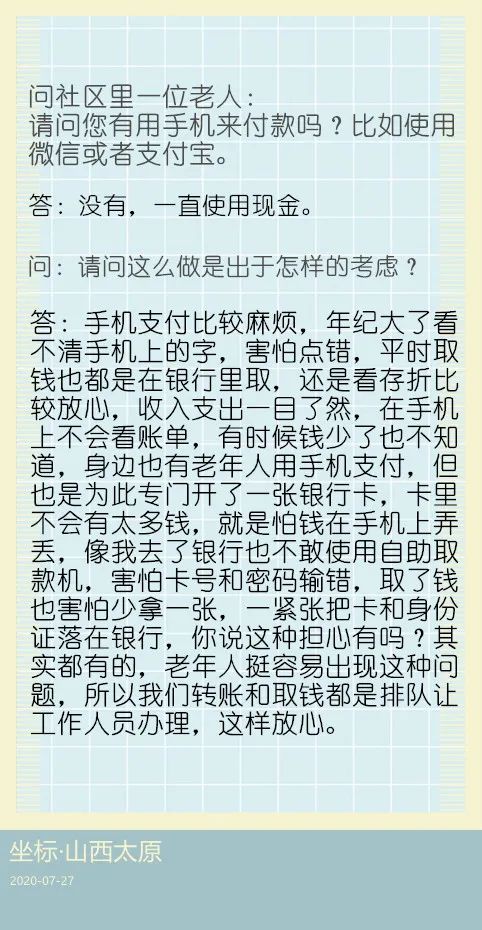 本次采访对象为周边小区的退休老人,通过采访发现65岁是一道分水岭,65岁之前的老年人刚退休或将要退休,身体状况较好,眼睛在不佩戴老花镜的情况下尚能看清手机,且有一定学习新事物的能力,因而智能手机在这一部分老年人中普及程度很高,且这部分老年人愿意使用手机支付功能。而在65岁以上的老年人中有相当一部分老年人还在使用数年前的2G老年手机,在使用智能手机的老年人中,大部分人用智能手机与子女打电话,微信聊天,看新闻,获取健康知识,极少有人将手机与支付挂钩,对手机支付的担忧心理在这部分老年人群体中普遍存在。而中国65岁以上老年人有1.5亿以上,可以说这部分群体在数字难民中占有很大比重。