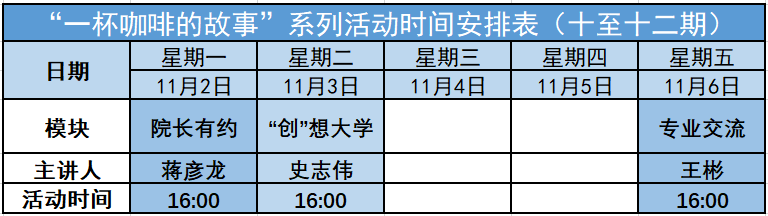 专业交流、“创”想大学模块精彩继续,本学期第一场“院长有约”也惊喜上线!快来了解一下十至十二期的“一杯咖啡”又有哪些大咖到场吧!