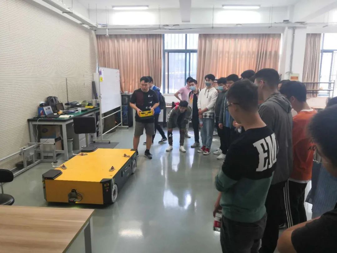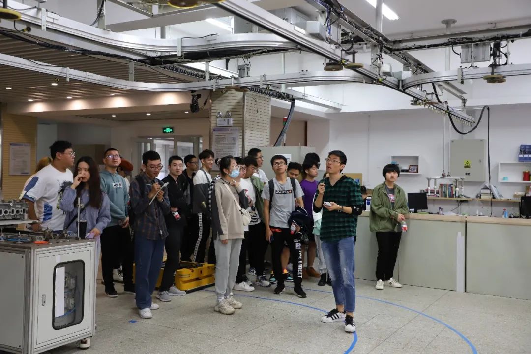现代集成制造实验室入门处陈列着许多奖杯奖状,讲解员依此向同学们介绍了现代集成制造实验室的发展与建设成果。随后,讲解员带领大家参观了实验室内的汽车装配线摩擦输送系统并简要解释其原理,还播放了几段视频,更直观地展现了现代集成制造技术在各类工程实践中的应用。最后,讲解员向同学们介绍了针对不同安装需求的各类AGV小车及其定位系统的运作原理。