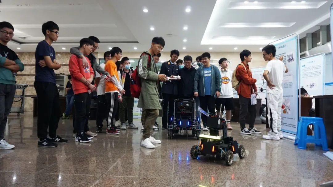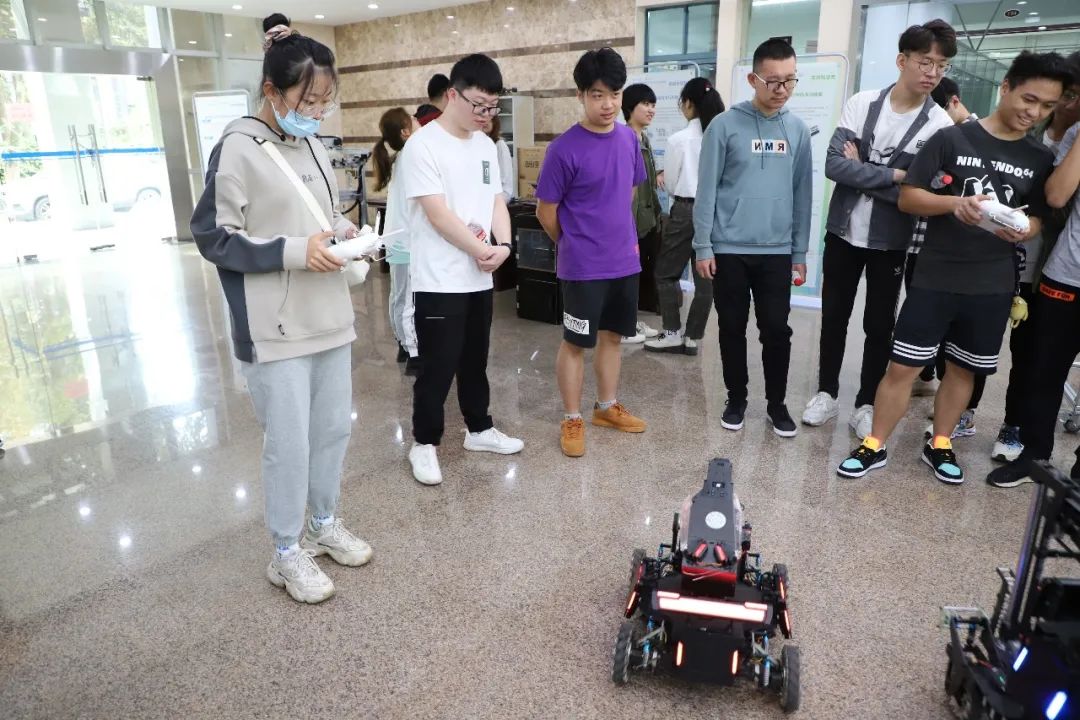 走进17号楼的大厅,就能看到各类机器人及相应的介绍展板,其介绍了步兵机器人、工程机器人等成果。在现场,同学们看到了两个车型机器人,创作者向同学们介绍了这两个机器人的功能,并邀请同学们使用遥控装置对机器人进行操作。在同学们的操作下,机器人前进,后退,转弯都非常灵活稳定。同学们和在场的学长们交流中,提出自己的疑问并获得了解答。