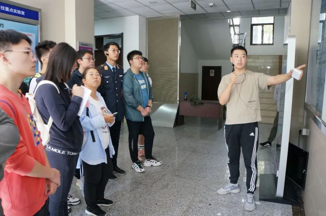 讲解员首先向同学们介绍了实验室的主要研究方向为飞机装配与数字化测量,通过展示一架机器人自动化测量装置为同学们讲解数字化测量的原理,随后讲解员又分别向同学们展示针对大型飞机、小型结构件、大型重结构件的装配与测量设备,同时详细讲述了飞机翼身对接工装的过程。最后讲解员为大家演示了数字化装配与测量中经常使用的智能牵引小车,阐述其运动原理。