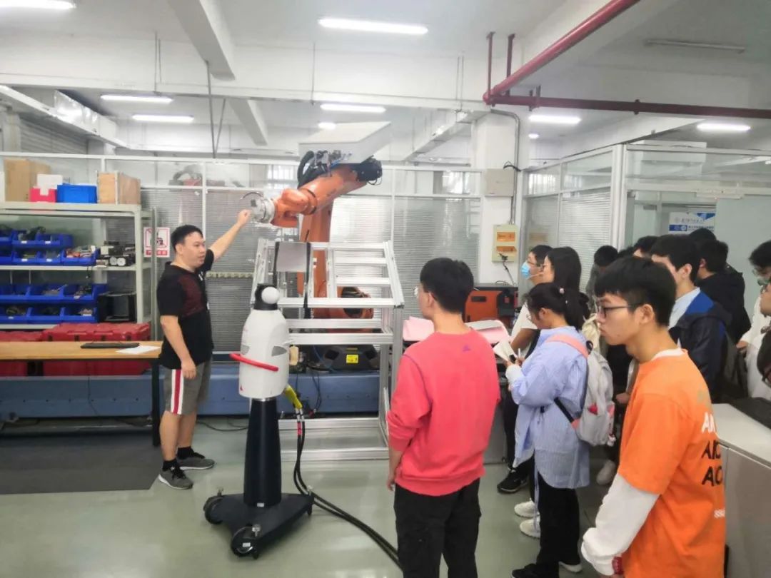 讲解员首先介绍了机器人智能装配,随后针对工业机器人加工颤振结构、机器人刚度强化技术、机器人精度补偿技术三个方向具体介绍了这一技术的发展并带领同学们参观了实验设备。智能装配实验室另一个研究方向是数字孪生与虚拟仿真技术,讲解员以C919为例向同学们讲解了大型飞机结构的智能化检测,同时展示了通过视觉技术、轨道计划和误差分析进行的大型结构装配过程,借助实验室开发的项目,许多同学体验了飞机装配模拟以及增强现实技术。
