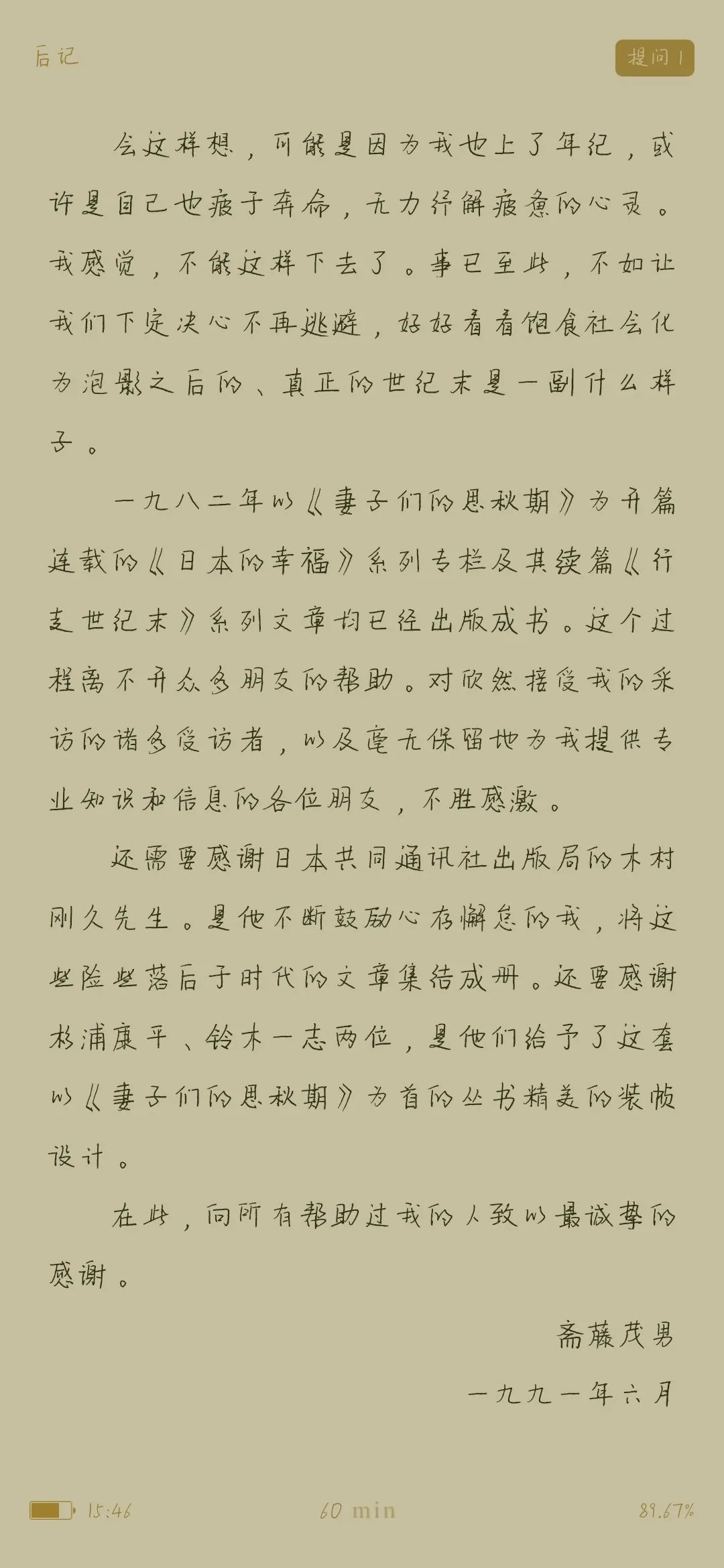 书中探讨的问题便是在日益繁荣的社会中,人们为何越来越无法真正的快乐。该书的高度写实让我看到了上世纪末日本泡沫经济下真实的样子。这本书给我的感觉十分真实,甚至会觉得斋藤提前窥视着我们现在的生活。其中提到了不少八十年代的高频词汇,而这些词汇也是当今社会的热词,甚至会让人怀疑我们正在重蹈上世纪八十年代的覆辙。