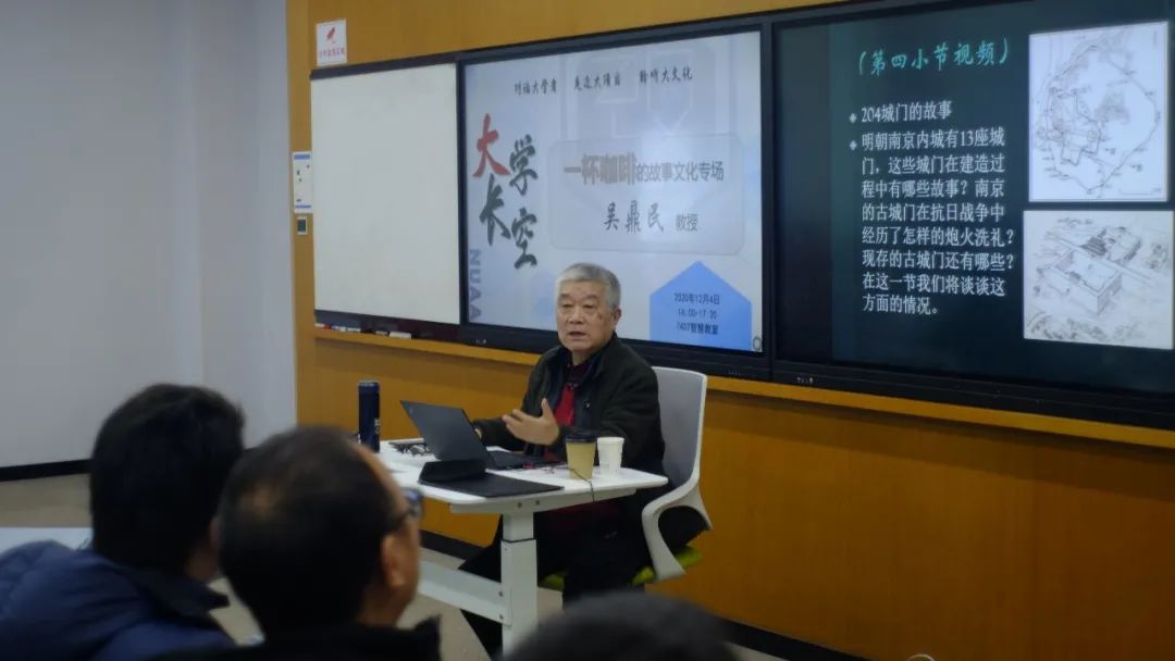 “我常常带外国教授参观南京的城墙,往往会给他们带来极大的震撼。”吴鼎民教授首先从与外国友人游历南京的趣事谈起,讲到南京中华门宽广厚重的城墙,是南京极具历史价值的古建筑,不同于国人的习以为常,许多外国友人对于南京名胜古迹都深感气势之盛,文化之远。吴教授随即以“虎踞龙盘,形胜之地”这一主题,介绍了历史中的吴王宫,明城墙和明故宫等等,借此讲述南京在历史长河中的重要文化地位,让在南航求学的同学们感受到了一种由衷的自豪感。