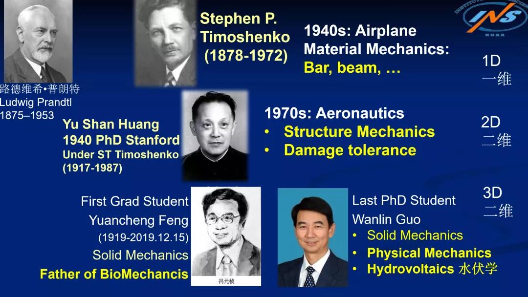 郭院士还分享了自己师门三代如何传承发展:Timoshenko先生对材料力学进行了杆、梁等一维层面上的研究;而黄玉珊教授在跟Timoshenko先生学习时研究“板受任意载荷的屈曲变形问题”,这是二维层面上的研究;郭院士作为黄玉珊教授的关门弟子,在当时为支持国内各大型号飞机的研制,在博士期间刻苦钻研,解决三维层面的力学问题。同时,郭院士特别提到了自己的老师黄玉珊教授的“家国情怀”,黄先生在外留学期间刻苦努力、成绩优异,仅一年时间便修得斯坦福大学博士学位,黄先生毕业时,正值日本侵略军猖狂侵华,他意识到“天下兴亡,匹夫有责”,立下“炎黄子孙,学有所成,应报效祖国”的宏愿,毅然离美回国,航空报国,指导设计了“延安一号”。郭院士谈及自己恩师,言辞之间仍然饱含崇敬之情,他表示老师从业之专注、爱国之赤诚,都让他深受鼓舞。除了在自己师门三代传承的知识体系中寻求新的突破,郭院士还继承钱学森先生的理念,在物理力学的框架下,结合流-固表界面耦合,提出了与“光伏”相对应的“水伏”概念。