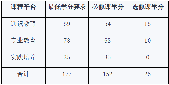 本专业学生在各课程平台中所修读的课程学分数需满足培养方案中各课程平台最低学分要求,在校期间学生需修满177学分方可毕业。各课程平台最低学分要求如下:
