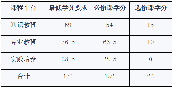 本专业学生在各课程平台中所修读的课程学分数需满足培养方案中各课程平台最低学分要求,在校期间学生需修满174学分方可毕业。各课程平台最低学分要求如下: