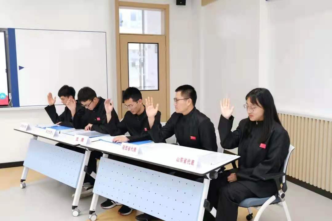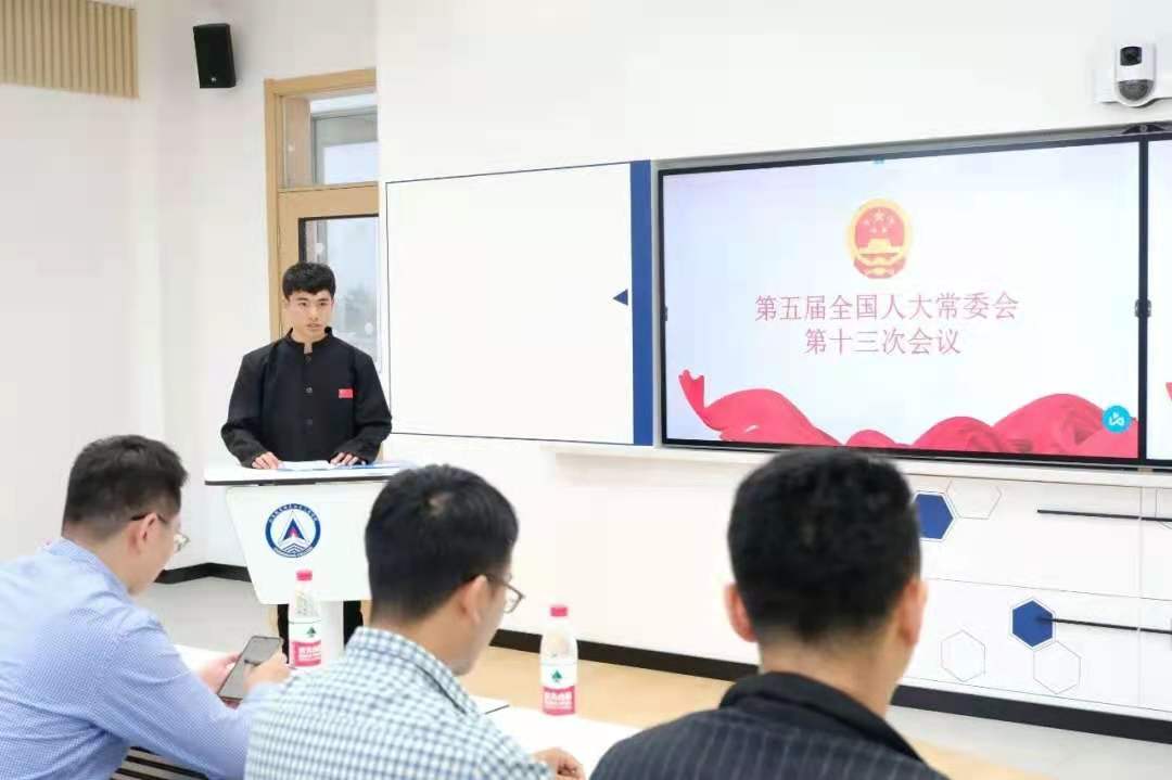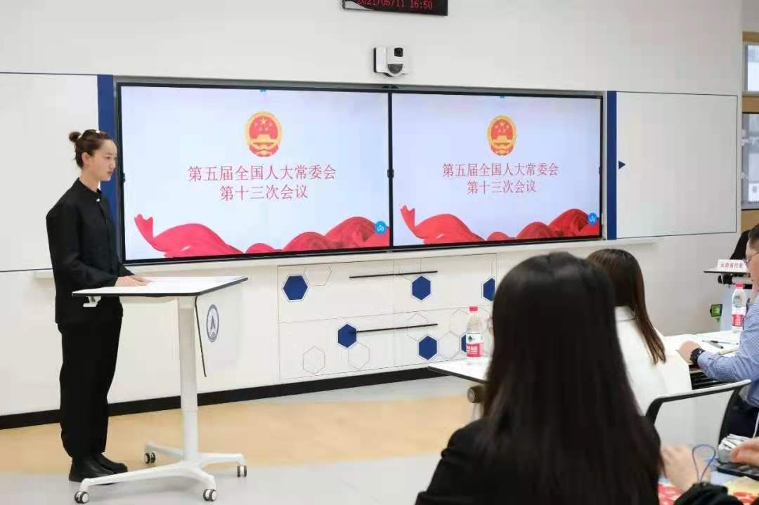 在对第五届全国人大常务委员会有了初步的了解之后,1820109班的几位同学通过几天内的探讨学习,以情景剧的方式生动地再现了这次会议。会议由地方代表发言、草案提出、草案审议、最终决议四部分组成。其中地方代表均用自己地方方言进行发言,极具地方特色。同时在本次会议的召开过程中,充分体现我国人民当家做主的政治制度体系,以及我党实现共产主义的奋斗目标。