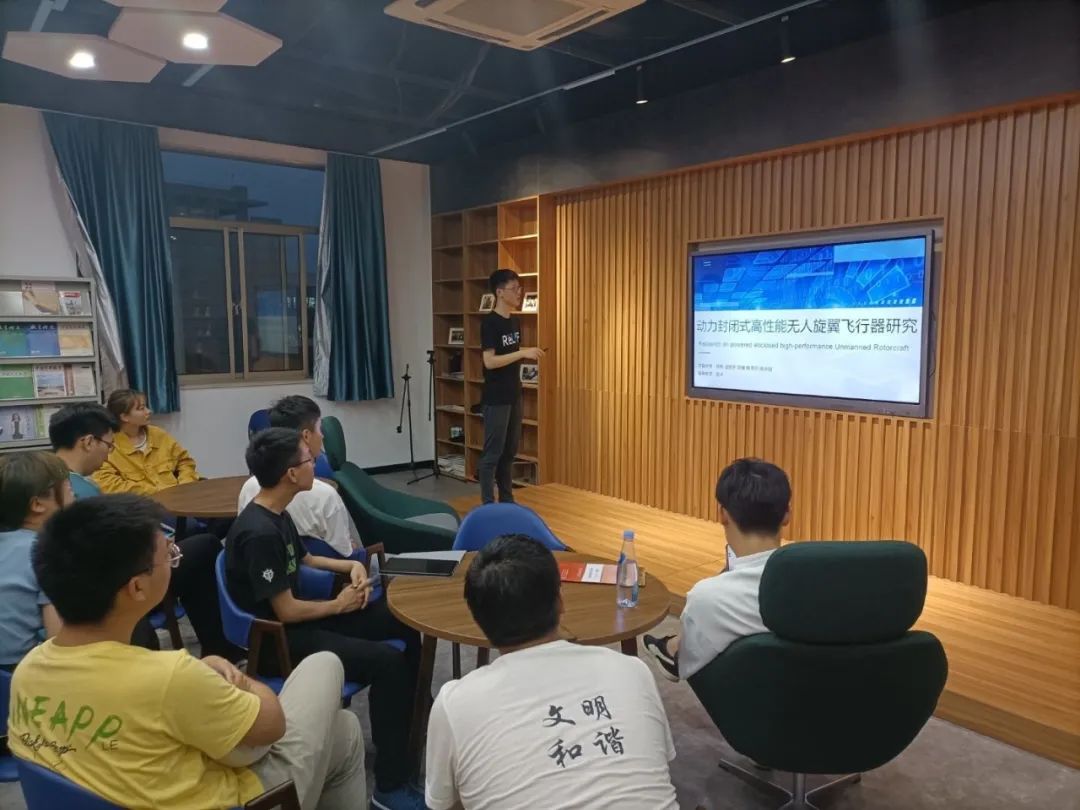 殷海标还向同学们分享了自己的大创经历:2019年参加陆洋老师指导的国家示范级大创项目《动力封闭式高性能无人旋翼飞行器研究》、2020年参加卢天健与倪长也老师指导的国家示范级大创项目《基于仿生设计3D打印轻质结构能量吸收性能研究》、2021年参加袁慎芳老师指导的大创项目《复合材料-金属混杂搭接结构的损伤检测和寿命管理》,并展示了其相关的研究成果、分享了宝贵经验。在《动力封闭式高性能无人旋翼飞行器研究》的展示中,他展示了此种飞行器外壳设计、涵道设计、3kg的推力并建议同学们做完一部分工作就写进报告中,一有参考,二算成绩。而《基于仿生设计3D打印轻质结构能量吸收性能研究》是偏理论的大创,参看文献工作繁重,用已学的知识分析,从人的肌肉组织找到灵感。