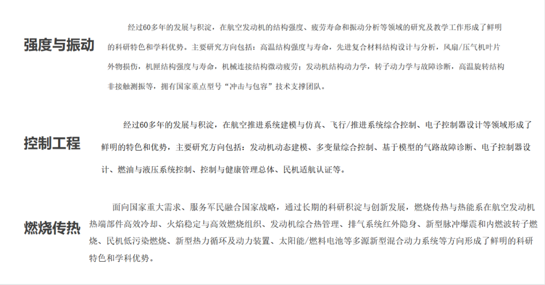 飞行器动力工程专业下分四个方向,内流与叶轮机械、强度与振动、控制工程和燃烧传热。