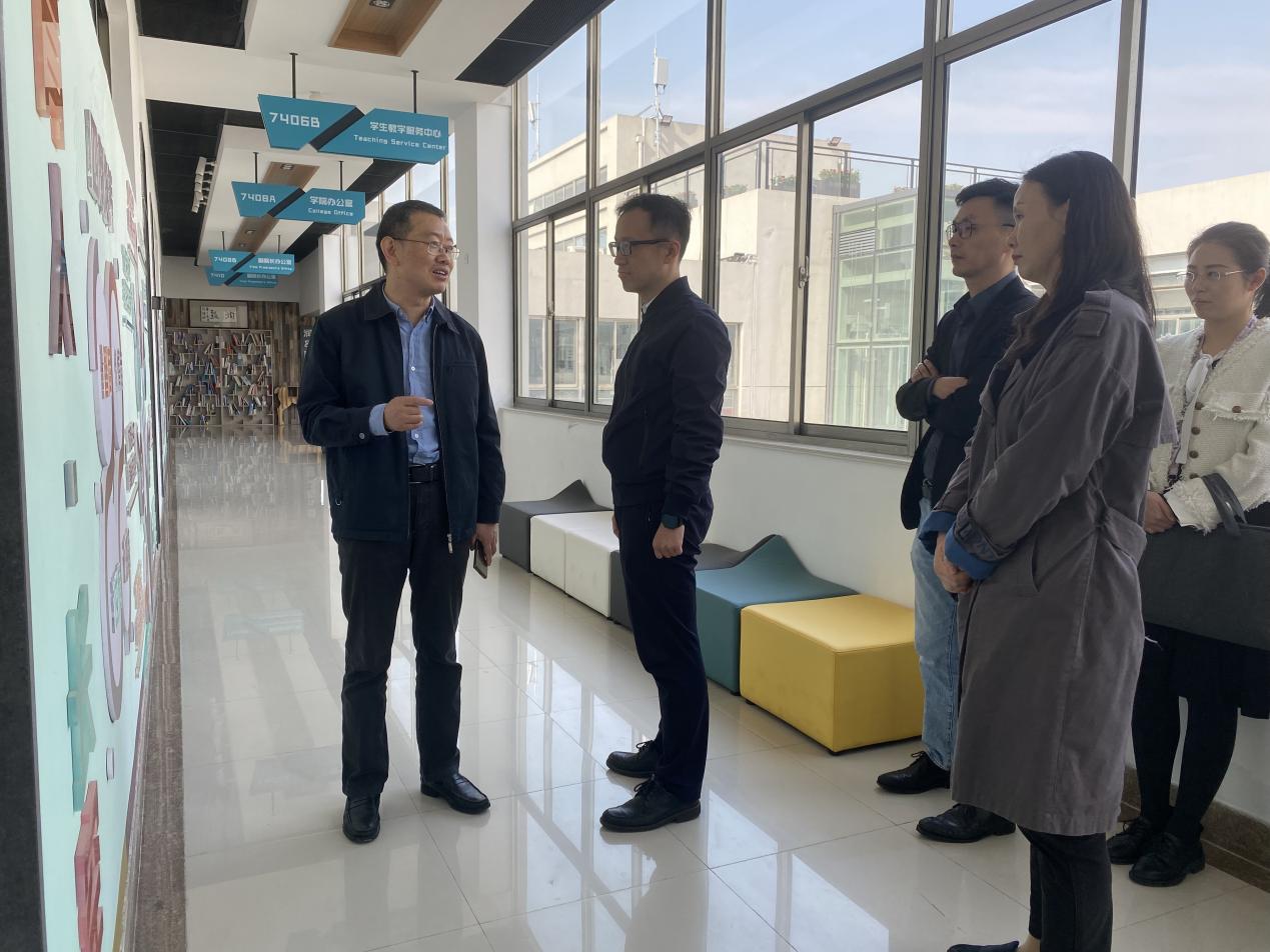 蒋彦龙首先带领研究生院一行参观了必威西汉姆联“准书院制”智慧教育空间三期建设成效,分享了学院依托科创工作室、美育工作室等推动本科生科研,培育学生社团文化的理念和举措。
