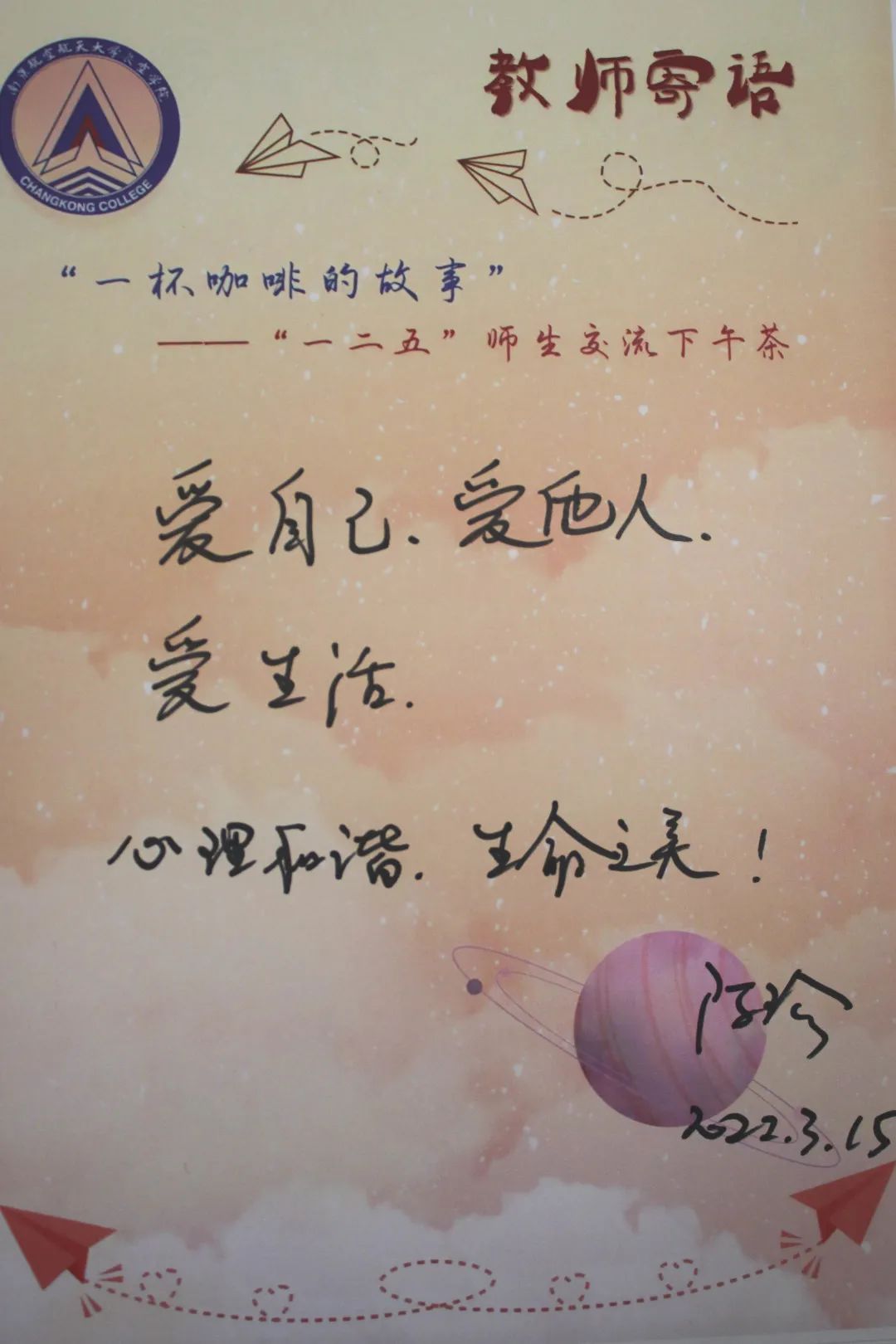 3月15日下午,南京大学社会学院博士、我校心理健康教育中心陈瑜老师做客必威西汉姆联“一杯咖啡的故事”,与长空学子进行了一场亲切、温馨的交流。陈老师言语温柔,深入浅出,分析透彻,让在场的同学们在轻松温暖的氛围中收获了心灵启迪。