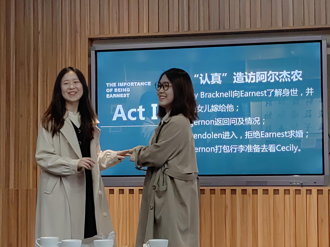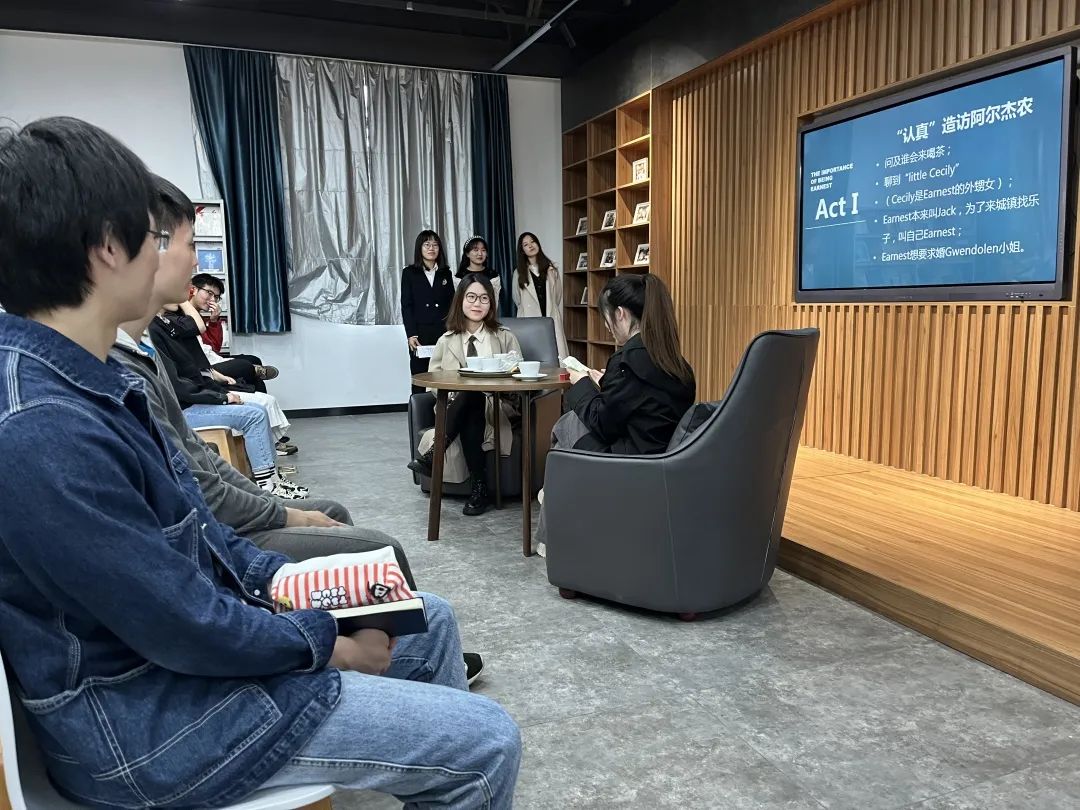 最后,同学们前往7104“润&致”悦享读书吧观看由《认真的重要性》改编的电影——《甜心大话王》,沉浸式体验戏剧情节,品味戏剧台词。