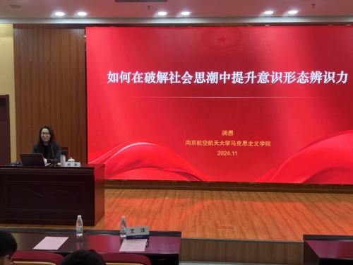 第三场专题讲座由马克思主义学院党委副书记阙愚主讲《如何在破解社会思潮中提升意识形态辨识力》。阙愚结合生活中的具体案例,以学生们喜闻乐见的方式详细介绍了青年亚文化相关的社会思潮,生动阐释了在多元化的社会思潮中提升意识形态辨识力的重要性和必要性,通过幽默风趣的讲授方式将社会思潮这一抽象的概念具象化,引导同学们在轻松愉快的氛围中自觉践行社会主义核心价值观。