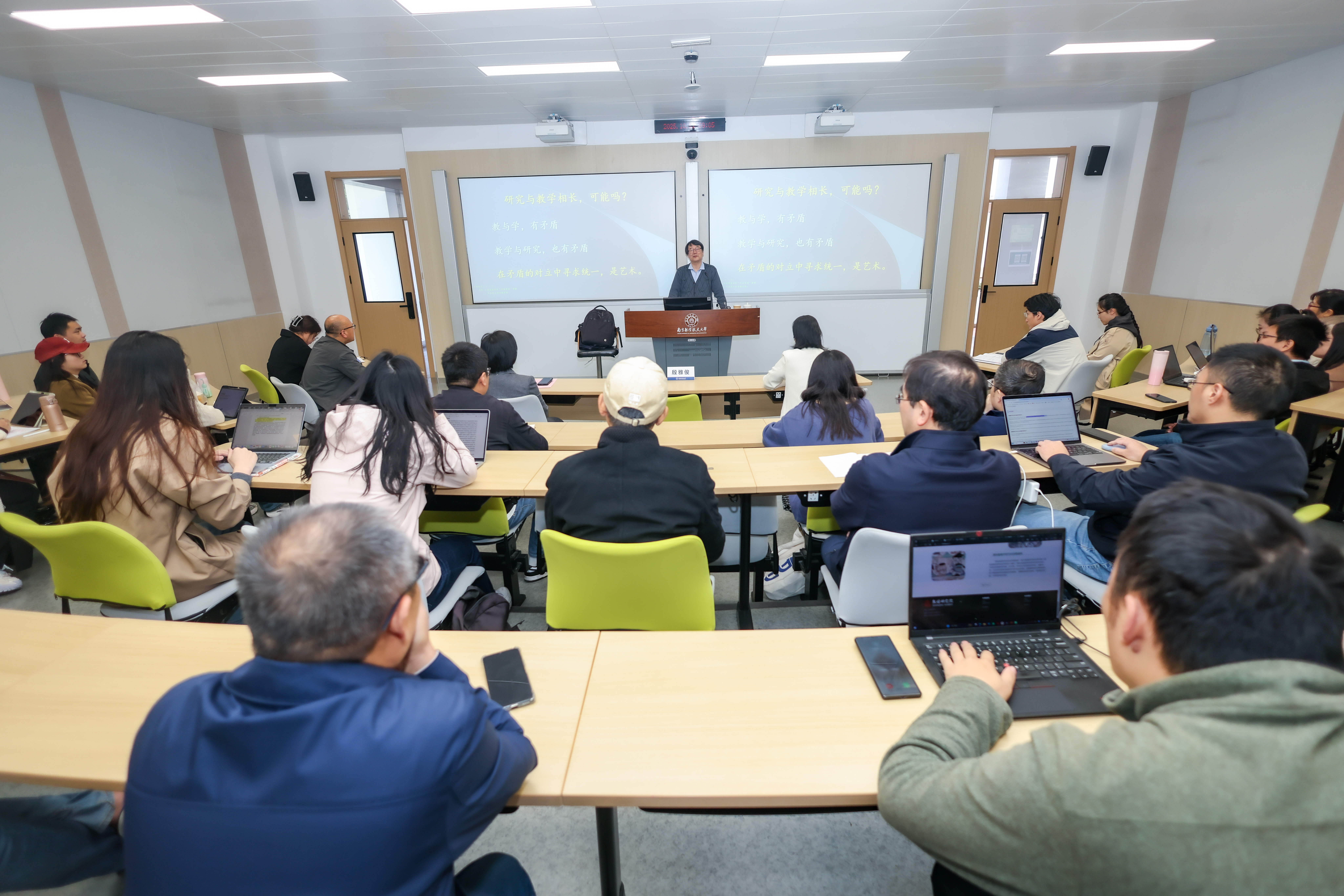 殷老师以自身职业成长为例,指出在“教研相长”的路径中,价值判断、跨学科融合与思维培养是驱动教学与科研的三大核心。他强调,在研究上要勇于突破传统瓶颈,在教学上需审慎思考AI时代真正值得传授的内容;同时指出,有价值的研究成果多源于跨学科启迪,而当前过细的课程分类亟待打破壁垒。在思维层面,他尤为强调明辨性思维、辩证性思维与创造性思维的综合培养。他还通过指导青年教师提炼课程亮点、帮助博士生突破科研瓶颈等案例,具体展现了“教研相长”的实践成效。最后,他总结到,教学与科研是双向赋能、循环促进的有机整体,教研相长需长期坚持,跨学科融合是核心路径,而高阶思维的养成则是其灵魂所在。